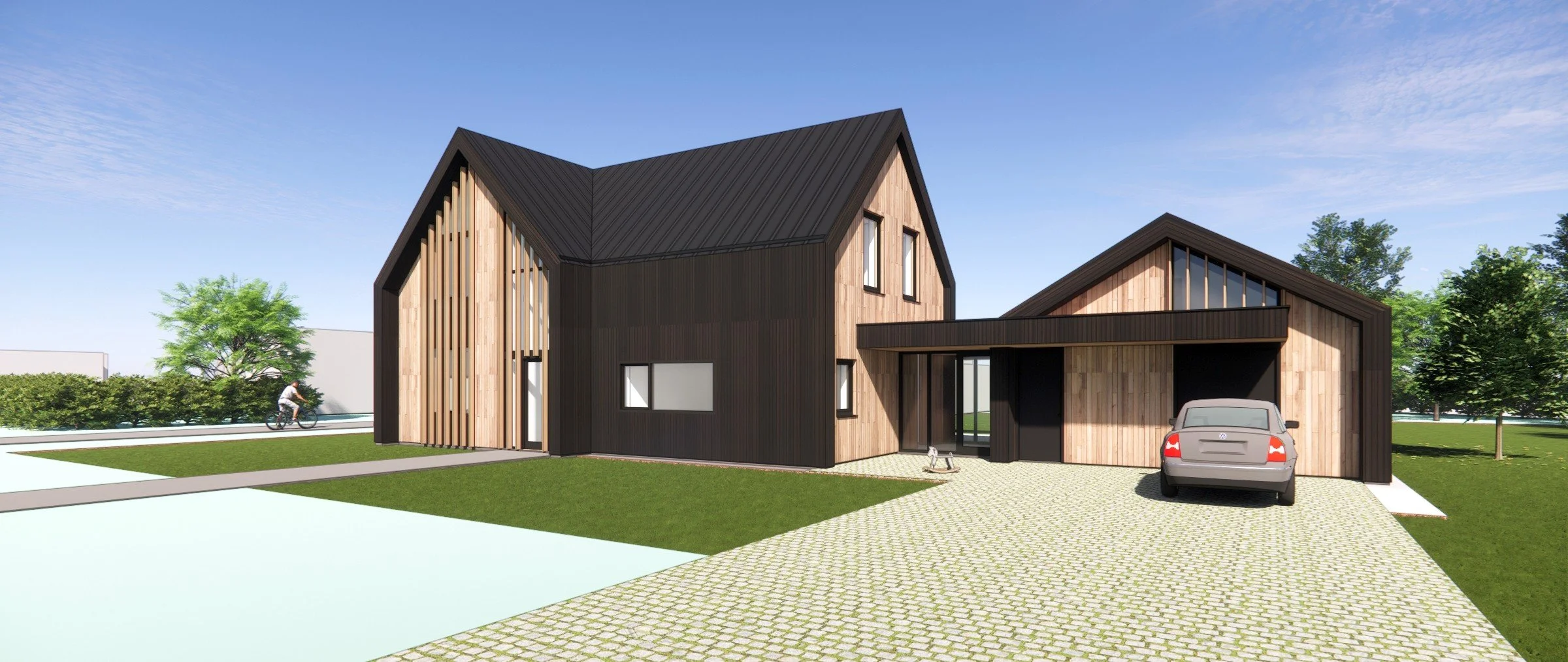 De architectuur accordeert met de naastgelegen woning op de Buitenplaats. We kiezen voor donkere houten een metalen felsdak. Op de kopgevels komen lichtere houten delen en bij de grotere openingen verticale lamellen. De goten worden uit het zicht gedetailleerd, zodat de hoofdvorm goed tot zijn recht komt.